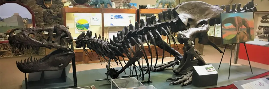 The Carter County Museum is Montana’s first county museum and the first to display dinosaurs found in the state of Montana. Ekalaka has been at the epicenter of dinosaur discoveries for the past 100 years, and is continuing to be a source of scientific discovery. The Lambert Room, dedicated to paleontology displays, includes exhibits of a mounted Edmontosaurus annectens skeleton (one of only a few nearly complete skeletons of this species), as well as a complete Triceratops skull. In addition, the badlands in the area have produced pachycephalosaurs, plesiosaurs, ankylosaurs, pterosaurs (this is the only known specimen from the Hell Creek Formation), mosasaurs, and the most complete juvenile T. rex. The museum has mounts and casts of each of these species, along with other authentic dinosaur bones.